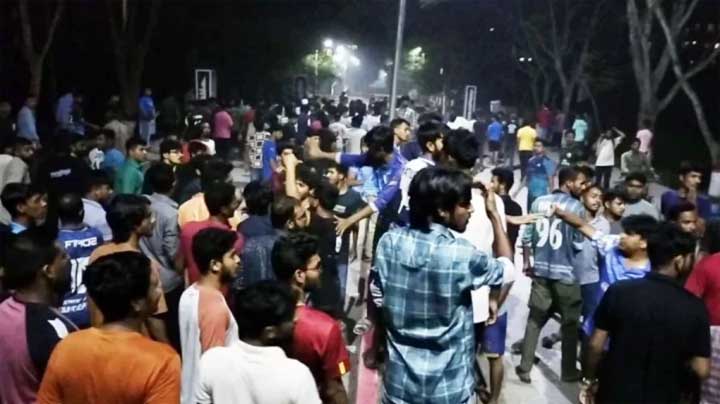 রাত সাড়ে ১০টায় সরেজমিনে দেখা যায়, শিক্ষার্থীরা হামলাকারী বহিরাগত দুই যুবককে আটক করে প্রক্টর অফিসে নিয়ে যান।