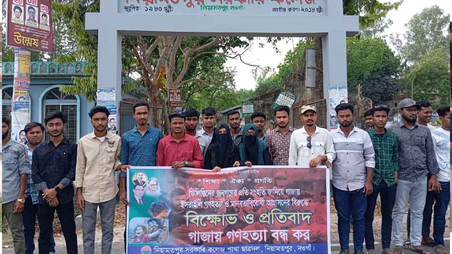 ফিলিস্তিনের গাজা উপত্যকায় ইসরায়েলি বাহিনীর চলমান বর্বরোচিত হামলার প্রতিবাদে বাংলাদেশের জাতীয়তাবাদী ছাত্রদলের কেন্দ্রীয় কর্মসূচির অংশ হিসেবে নিয়ামতপুর উপজেলা ছাত্রদল এক
