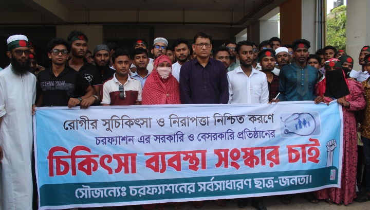 ভোলার চরফ্যাশনে সরকারি ও বেসরকারি হাসপাতালে রোগীদের সুচিকিৎসা ও নিরাপত্তা নিশ্চিত করতে ১৭ দফা দাবি নিয়ে আন্দোলন করেছে শিক্ষার্থীরা। এসব