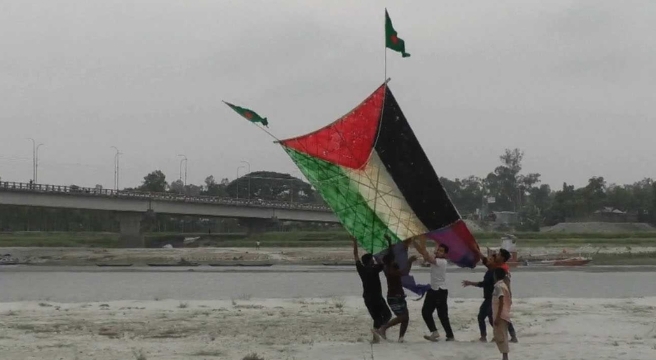 কুড়িগ্রামে ফিলিস্তিনি পতাকার আদলে ঘুড়ি উড়িয়ে যুদ্ধ বন্ধের দাবি