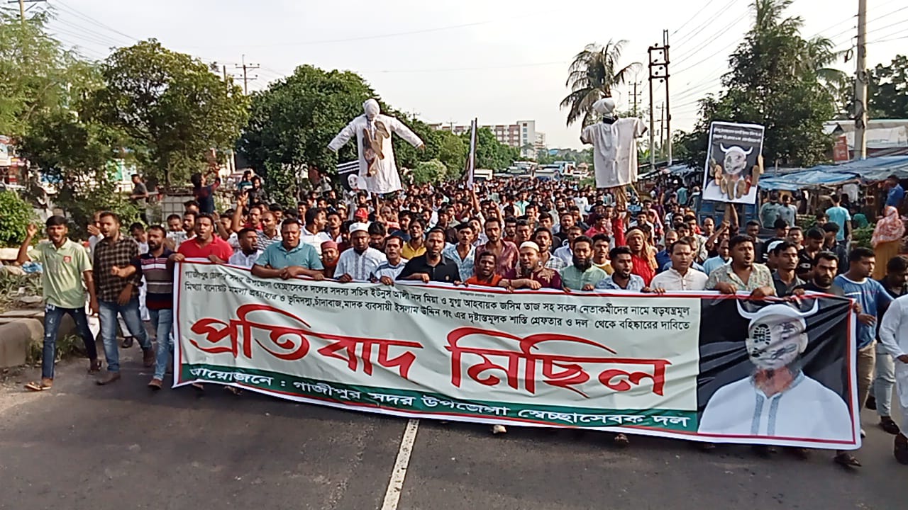 গাজীপুর সদর উপজেলা স্বেচ্ছাসেবক দলের সদস্য সচিব এবং যুগ্ন আহবায়কসহ সকল নেতাকর্মীদের নামে ষড়যন্ত্রমূলক মিথ্যা মামলা প্রত্যাহারের দাবিতে বিক্ষোভ মিছিল