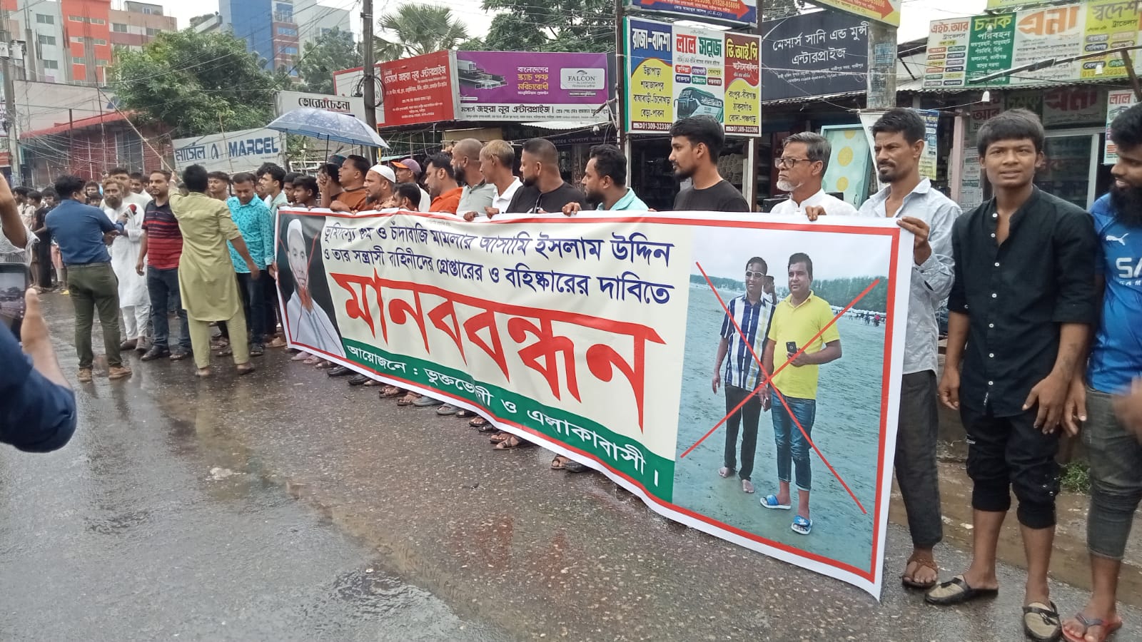 গাজীপুরে চাঁদাবাজির মামলার আসামীদের গ্রেফতারের দাবিতে বিক্ষোভ, মানববন্ধন